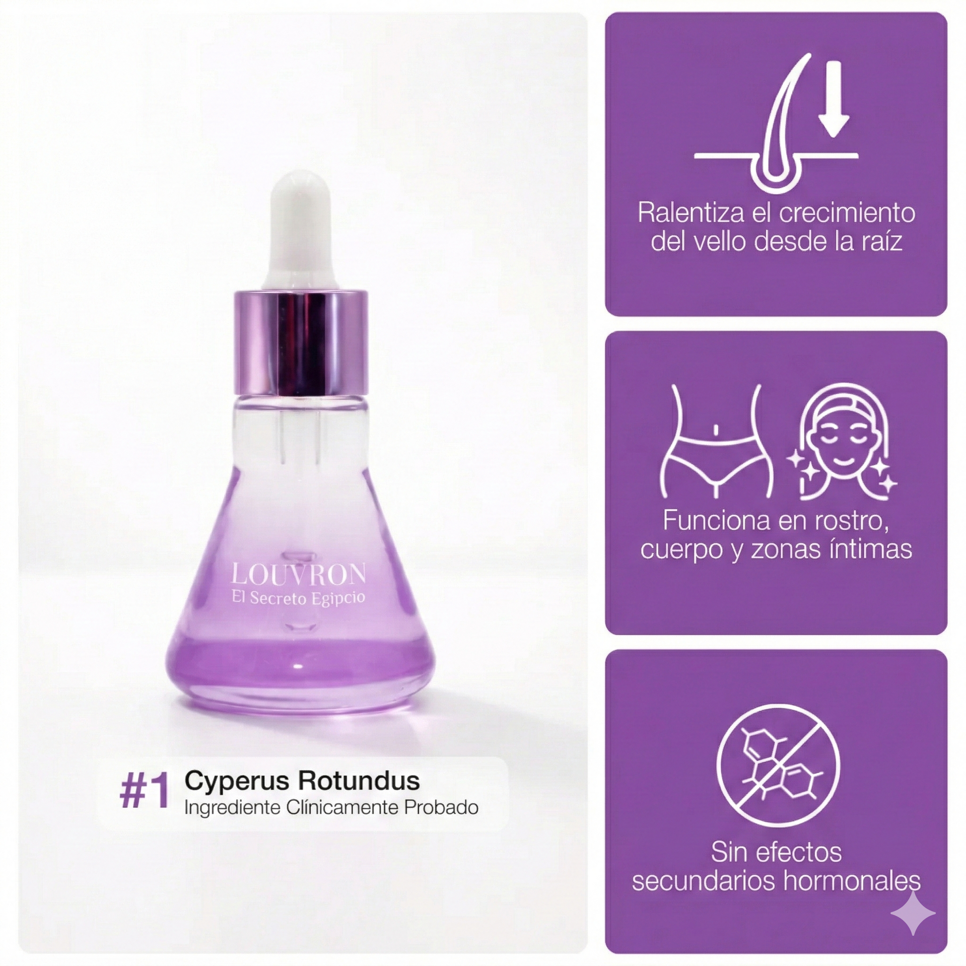 - Cyperus Rotundus | Extracto botánico de origen egipcio que ayuda a debilitar progresivamente el folículo, ralentizando el crecimiento del vello.