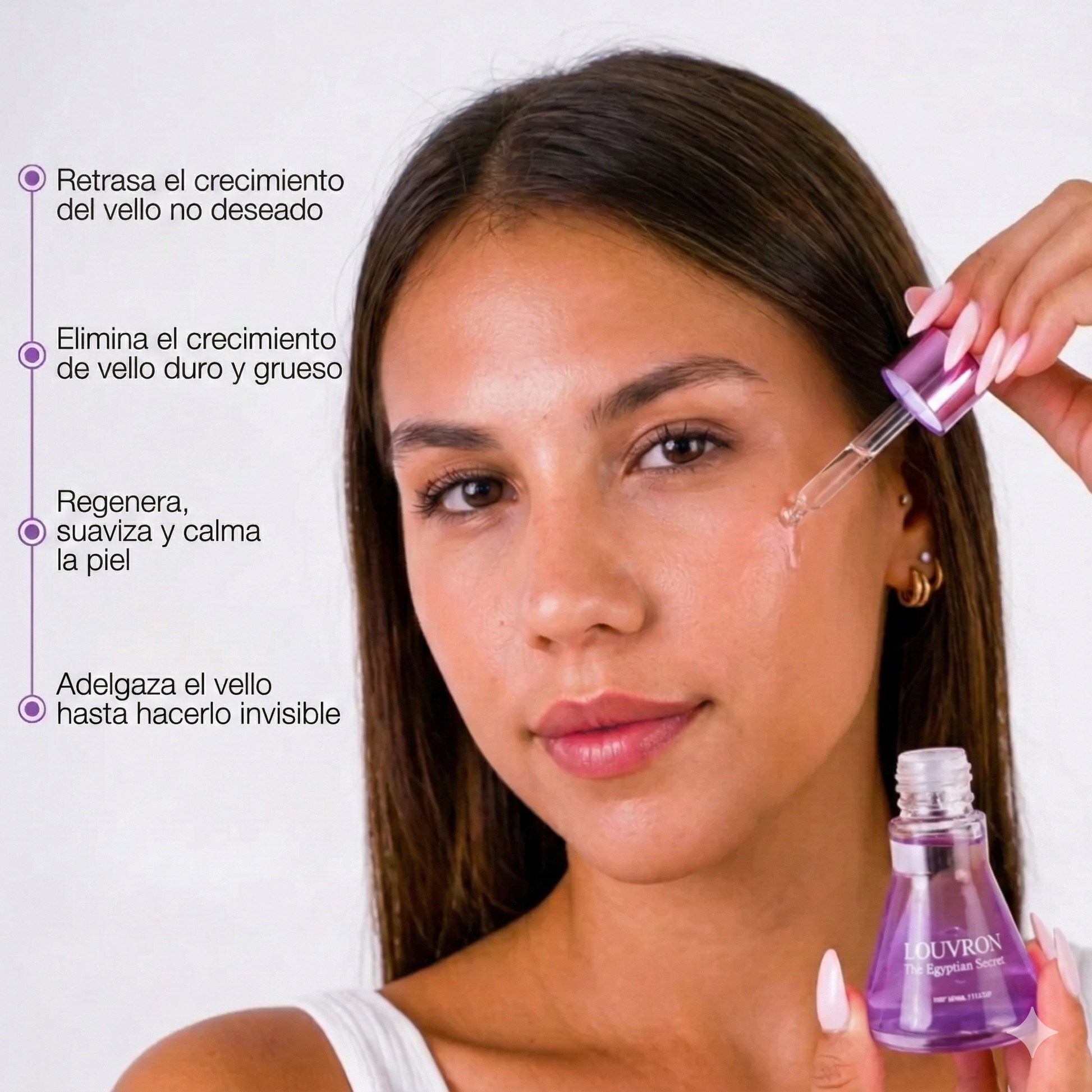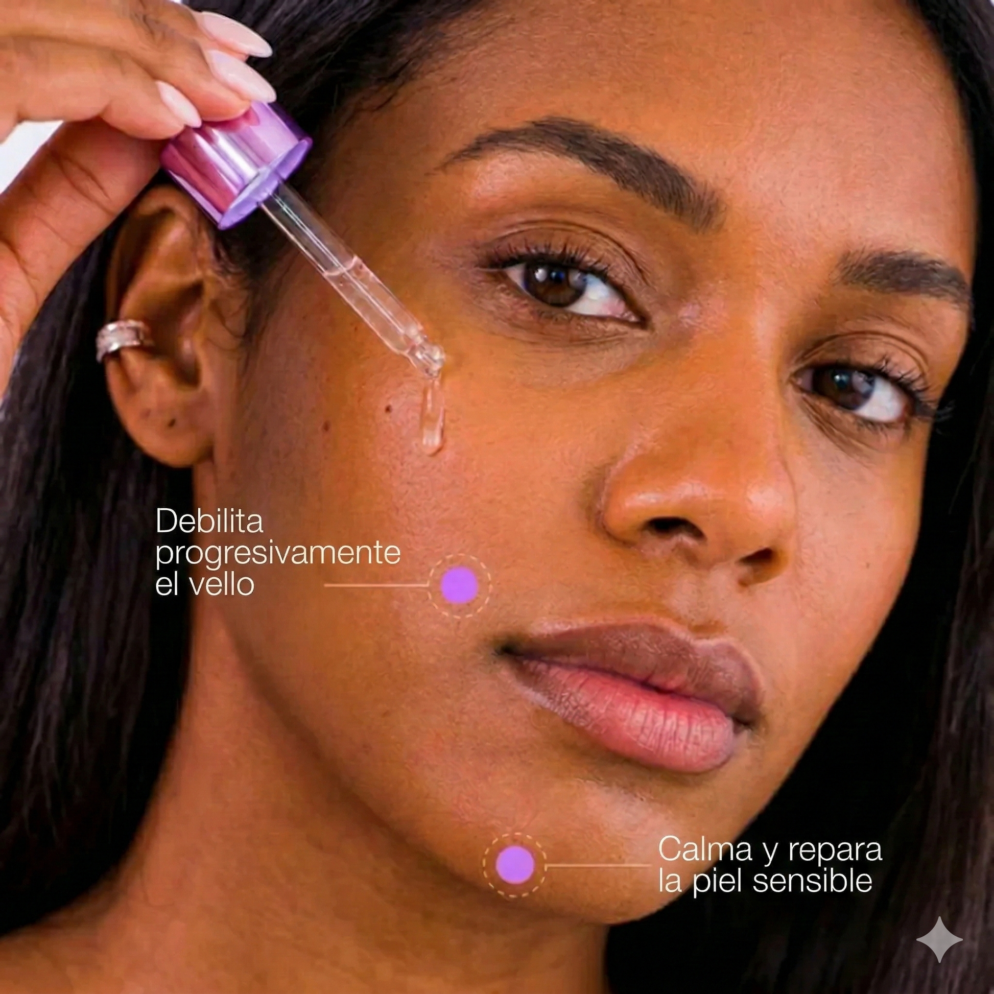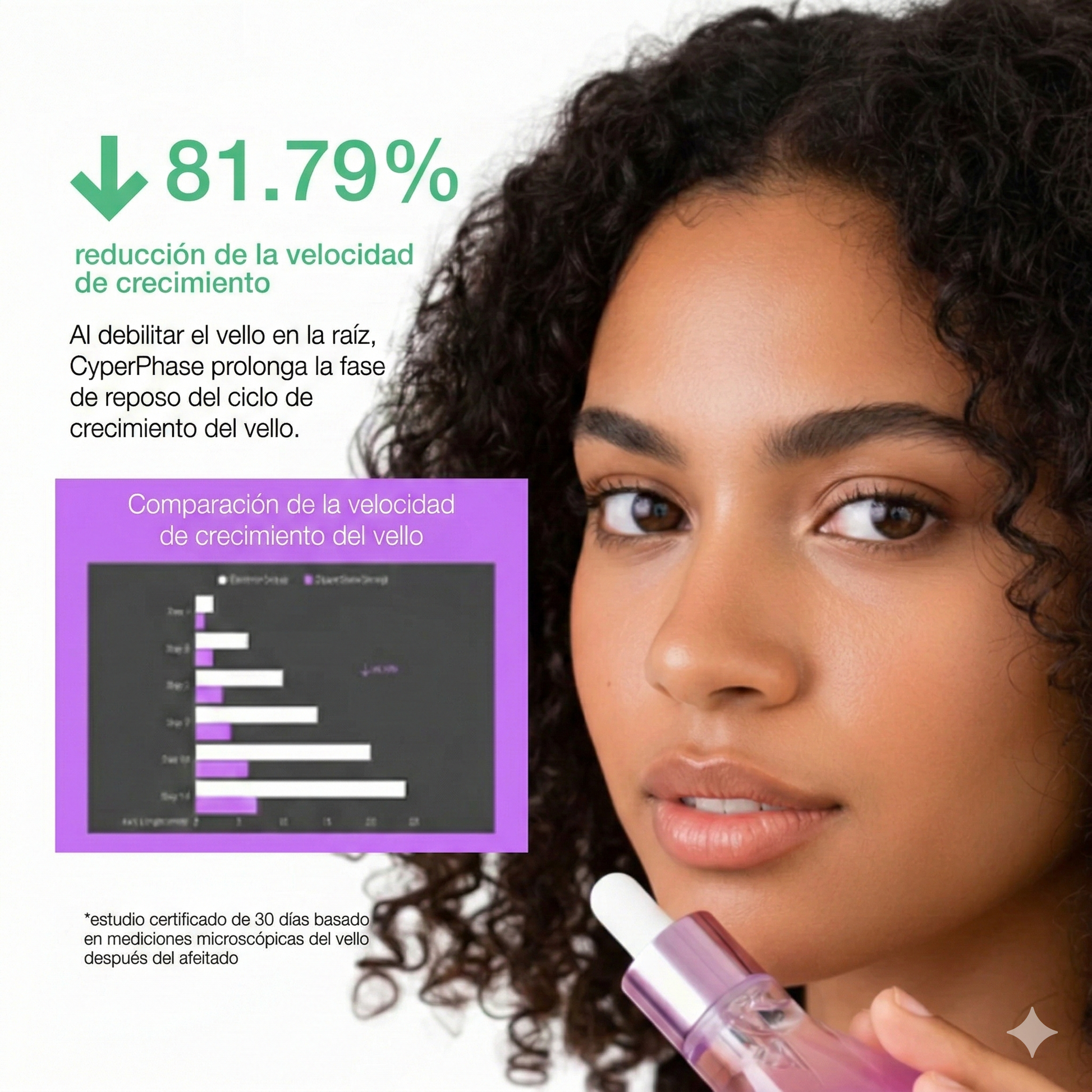 Este sérum lo ha cambiado todo. Ahora me quedo completamente suave durante 4-5 días, y el vello que vuelve a crecer es tan fino que ya no me causa irritación ni vellos encarnados.”