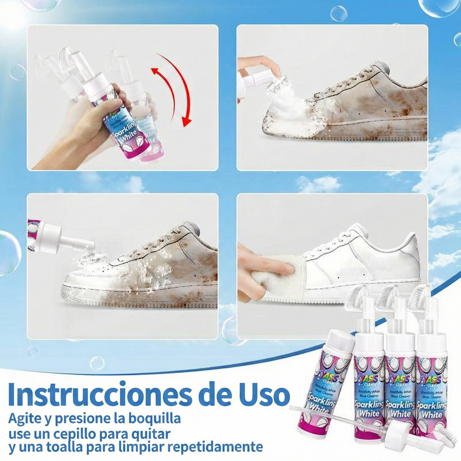 Se puede utilizar en una amplia gama de calzado, como zapatos blancos, deportivos, tenis, zapatos de viaje, zapatillas deportivas, zapatos casuales, etc. Nuestro limpiador de zapatos blancos está diseñado para satisfacer todas sus necesidades. Es una solución integral que simplifica su rutina diaria de cuidado del calzado.