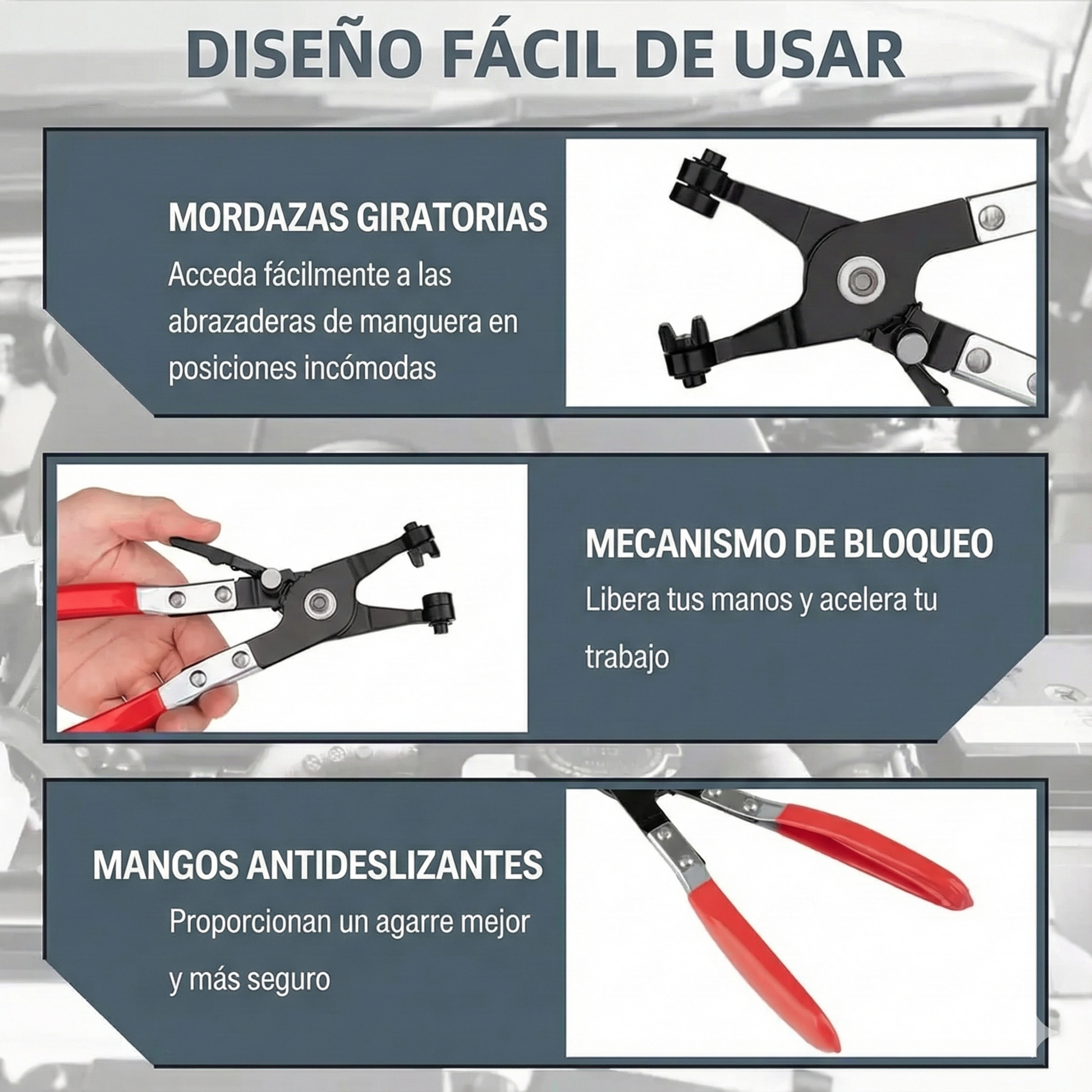 · Diseño de bloqueo: Este juego profesional de alicates para abrazaderas de manguera de largo alcance tiene todo lo que necesita para desmontar un motor.